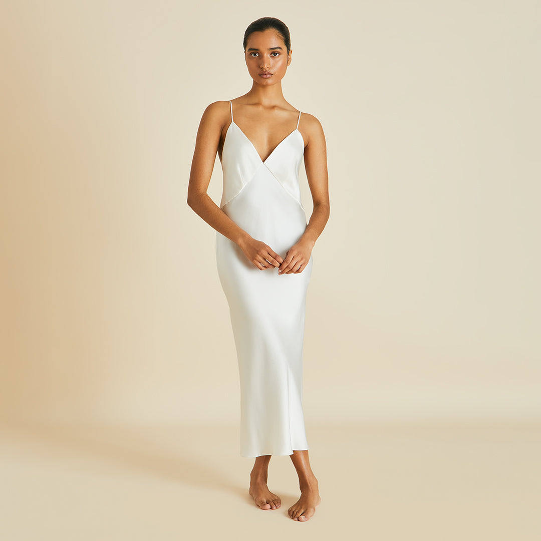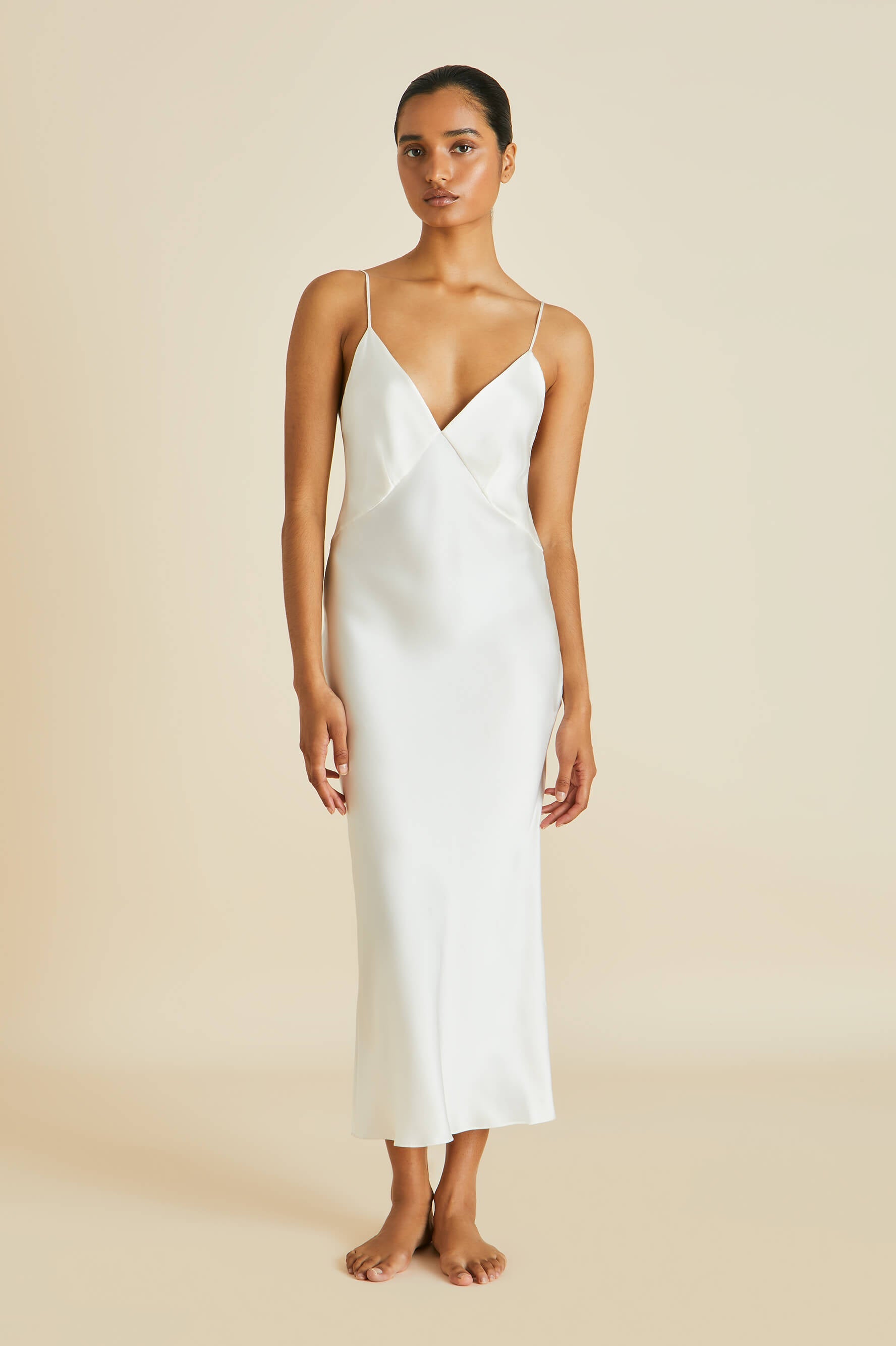 Inspired by the slip dresses of the 90s, Olivia von Halle creates a luxury spin on the classic silk slip dress. In luxurious ivory silk, this slip dress is elegantly cut to create the most versatile slip for a bridal do, or any evening occasion. The Issa in ivory is now lined for extra coverage.
