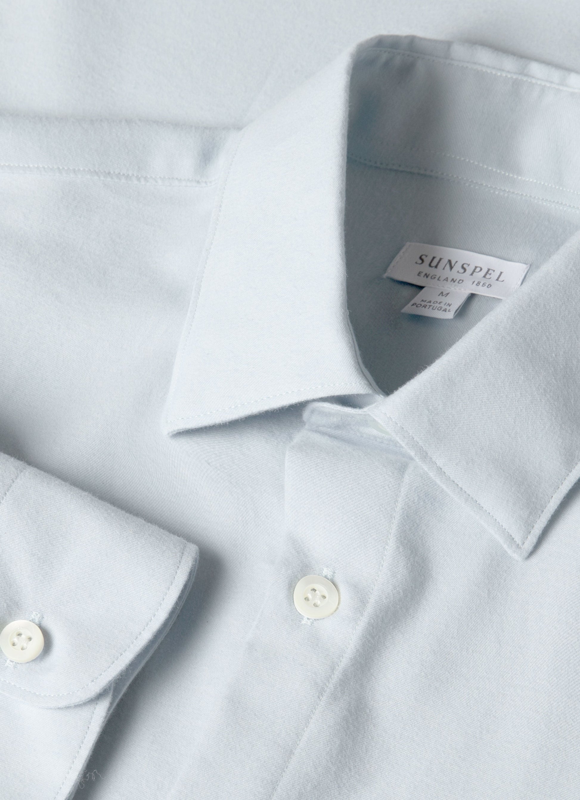 An elegant flannel shirt, crafted from a luxurious Italian blend of cotton and cashmere. The cotton provides a smooth handle, while the cashmere adds exceptional softness and warmth. Finished with natural shell buttons and a true-to-size fit, it offers refined comfort for the cooler months.