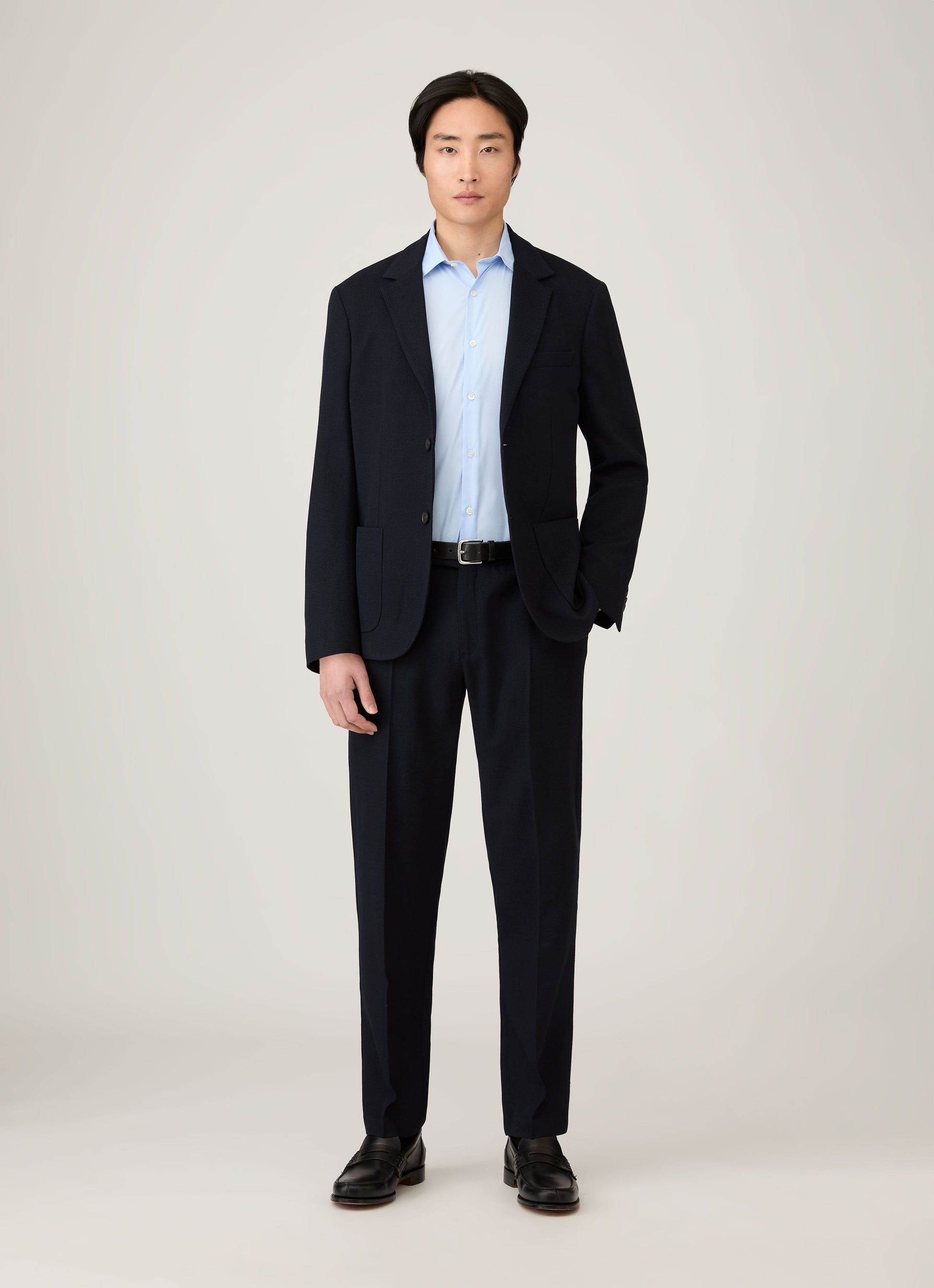 Crafted from a unique textured wool sourced from a specialist Italian mill, this trouser combines comfort with a refined, smart finish. Designed with an easy, straight leg, slanted pockets, and a tailored internal waistband with notch detailing. Pair with the matching jacket for an effortless, modern suit.
