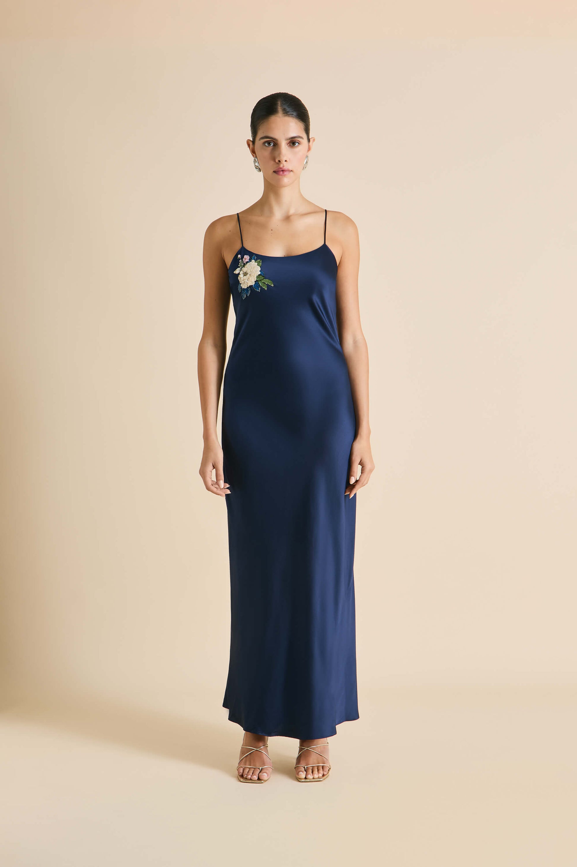 Our devotion to the perfect silk dress reaches new heights in sumptuous navy silk satin. Embellished with an intricate floral motif, she's ready to take the world by sparkling storm.