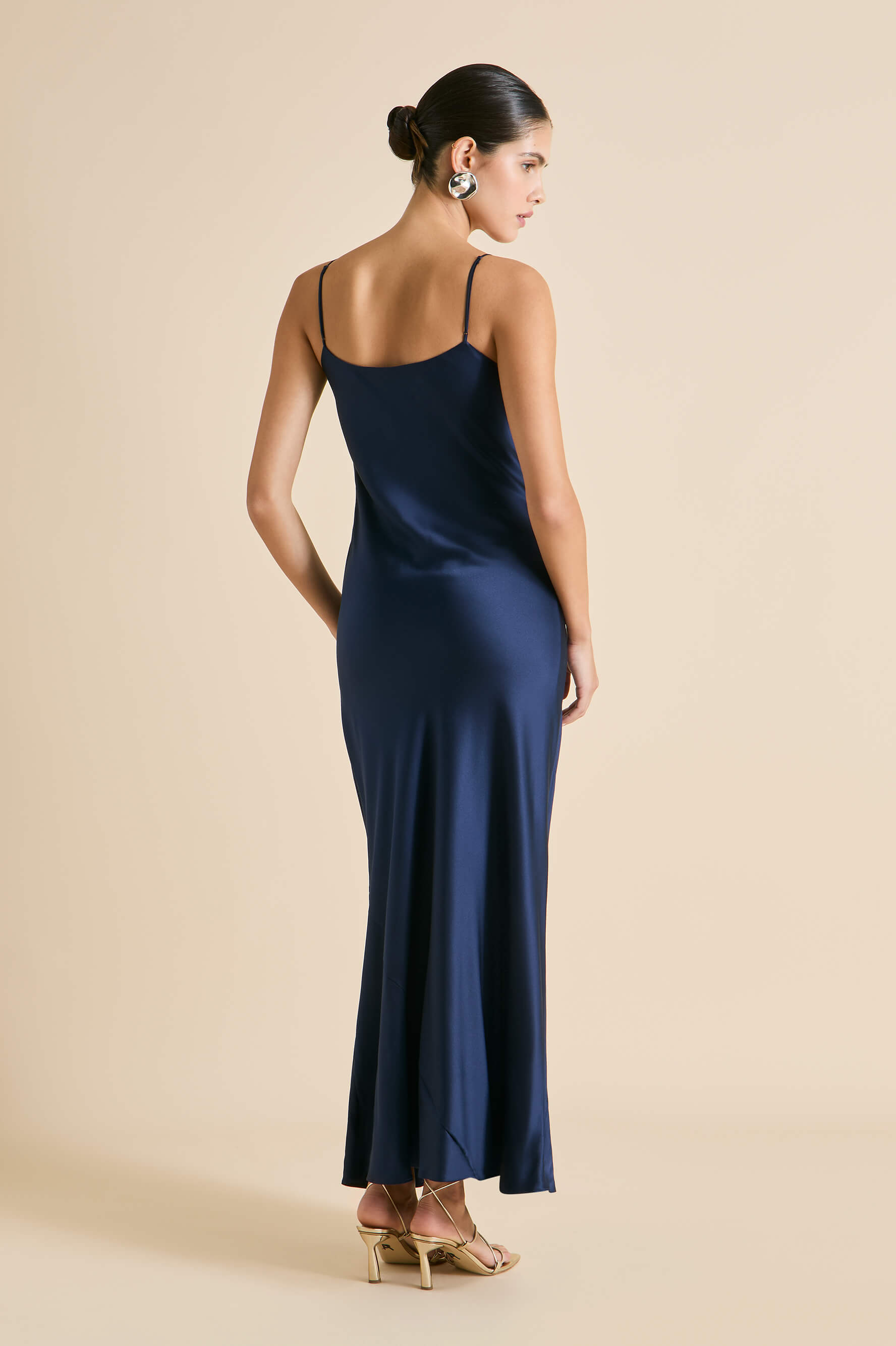 Olympia Harmonies Navy Embellished Dress in Silk Satin