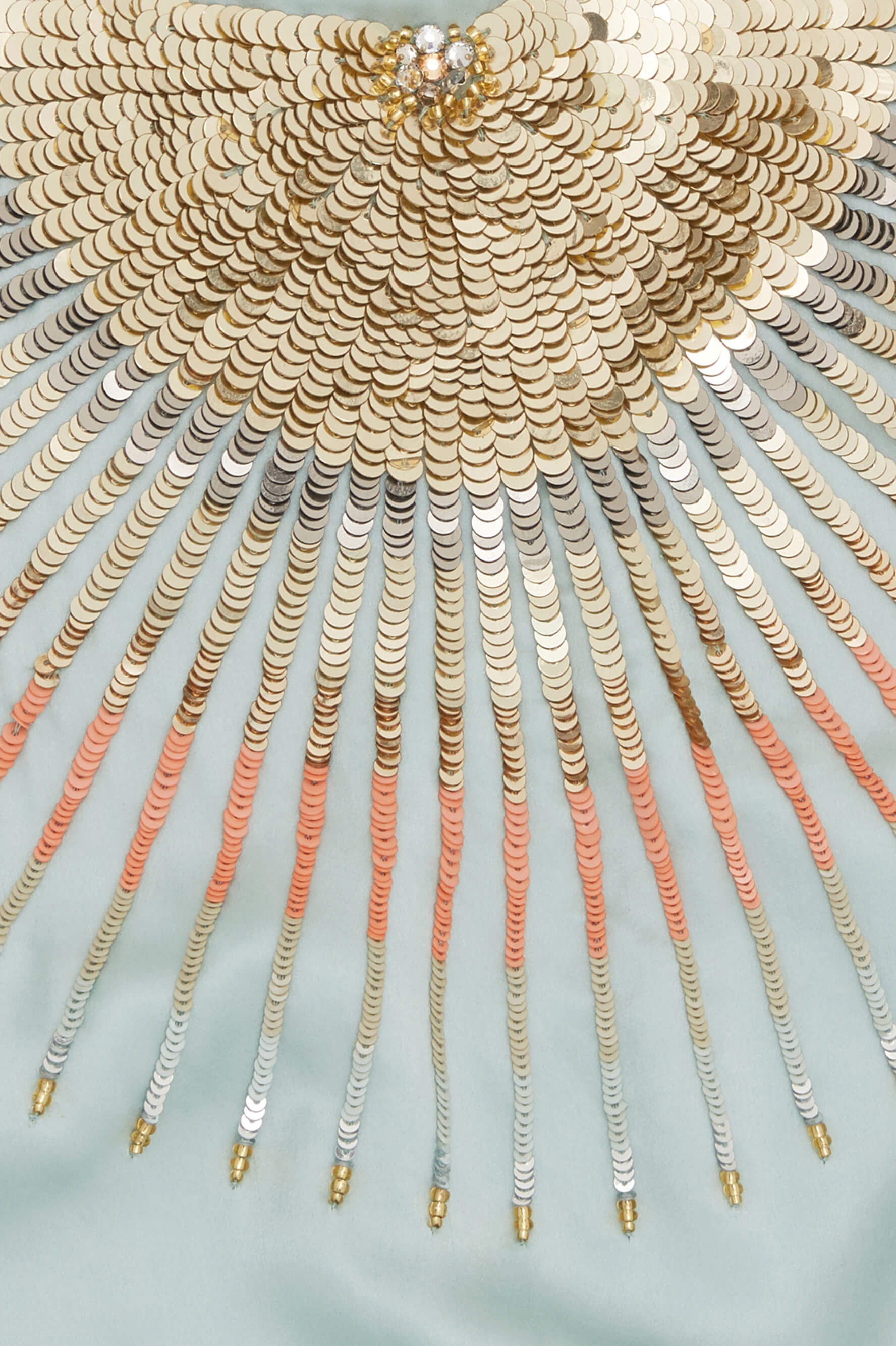 Named in honour of the formidable fashion editor and her trademark kaftans, our new-season Vreeland Incantation dress is crafted from a lightweight sandwashed silk in a dreamy shade of ash blue. For our limited-edition capsule collection, she steps out in especially lavish fashion, showing off no less than 21 hours of aari and zardosi embroidery. Characterised by gold threadwork and nature inspired motifs, both techniques have been lovingly practised for centuries to create revered pieces for kings, queens and bridal trousseaus.
